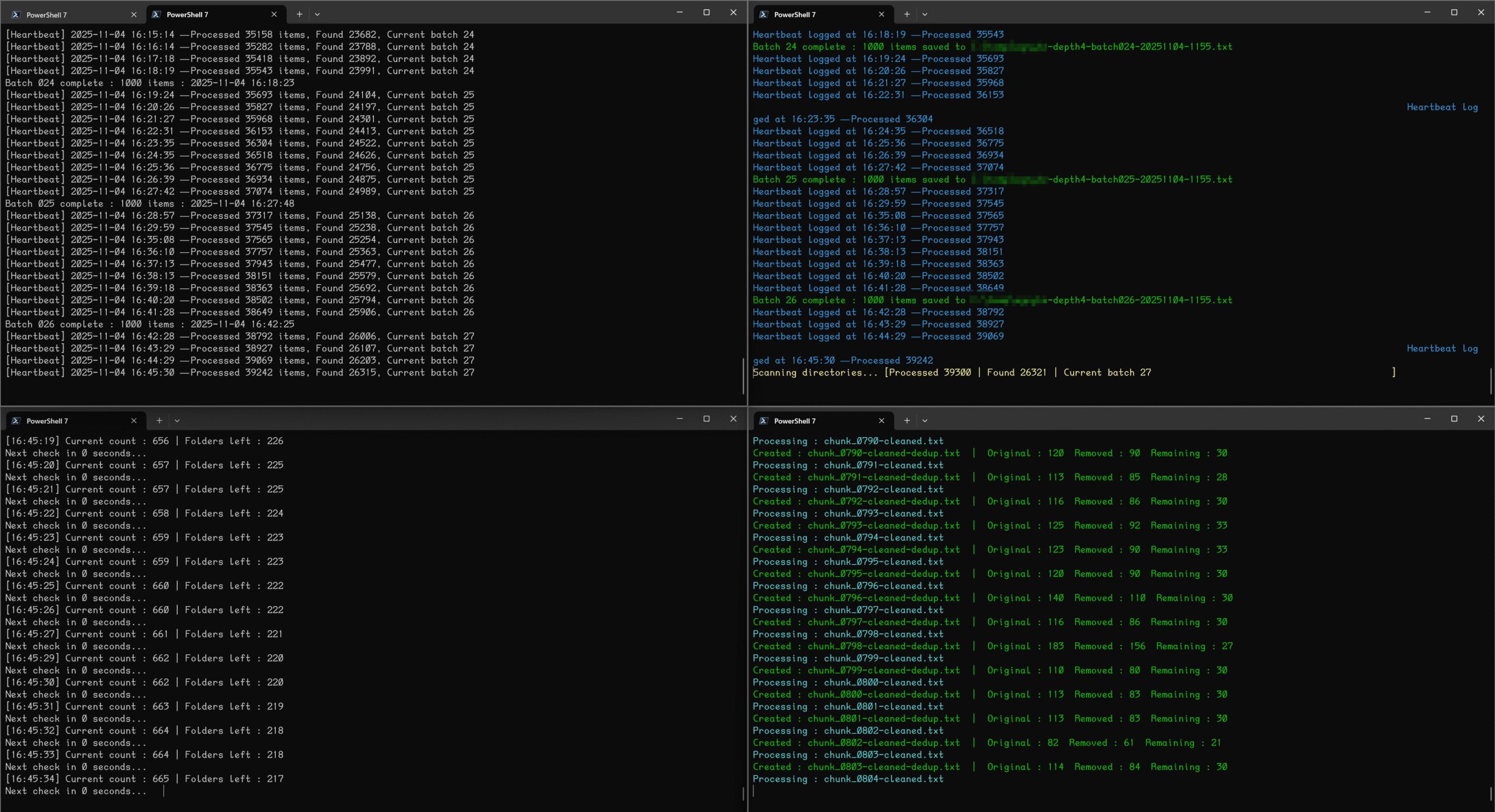 This is 4 different #PowerShell (version 7.5.4) sessions, all running in W11 25H2 Terminal. WHY you ask? Great question, because my Microsoft Excel is currently a gray screen with a blue spinning curser of DEATH! I have almost 1,000,000 rows of data to parse/process/dedup/filter/exclude/prune. This should be fairly simple operation for Excel, but NO!